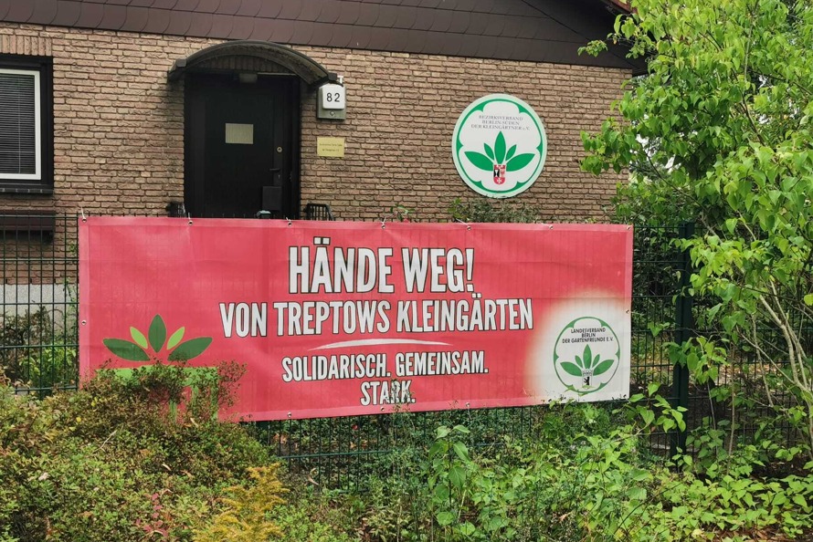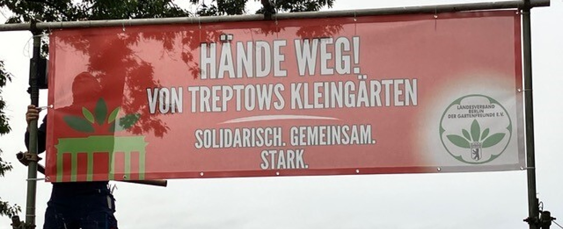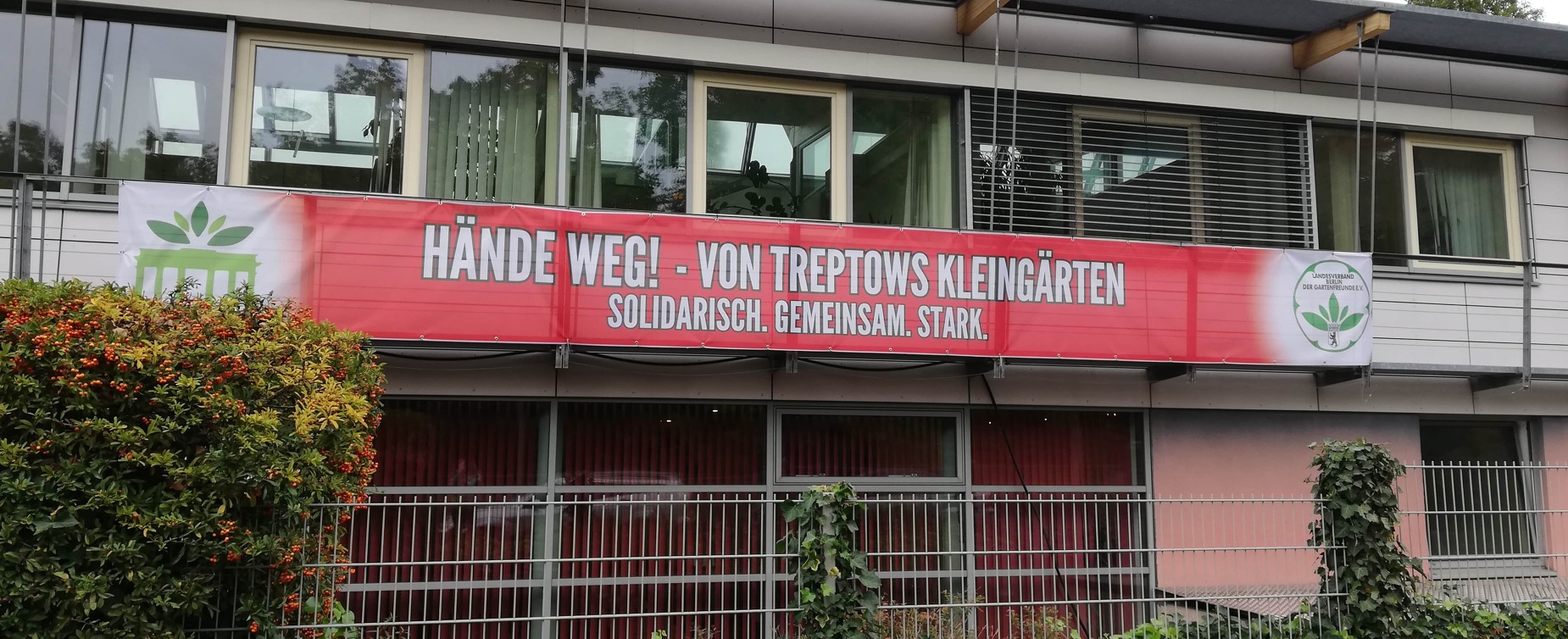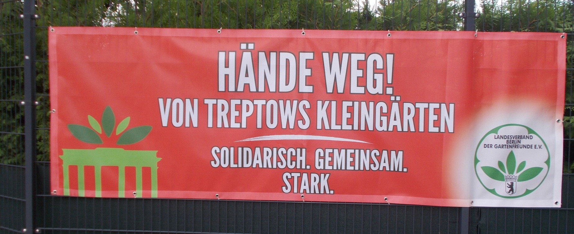 Der Landesverband dankt im Namen der betroffenen Gartenfreunde in Treptow-Späthsfelde allen Banner-Akteuren für die öffentlich gezeigte Solidarität ihres Vereins: Tausend Dank in die Bezirke! Leserinnen und Leser seien hier gewiss: es hängen mehr rote Banner in Berlin, als wir hier zeigen können.