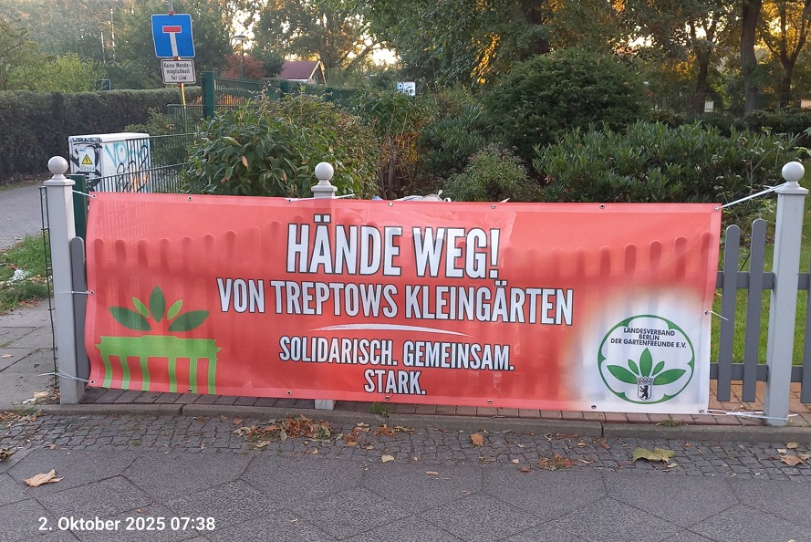Der Landesverband unterstützt den Protest der Treptower Kleingärtnerinnen und Kleingärtner mit der Banneraktion „Hände weg von Treptows Kleingärten!“. Viele Berliner Gartenvereine und Bezirksverbände zeigen sich solidarisch und haben seit dem 22. September 2025 in konzertierten Aktionen die roten Banner aufgehängt. Manche der Akteure haben ihre Solidarität dokumentiert und uns Bilder geschickt.